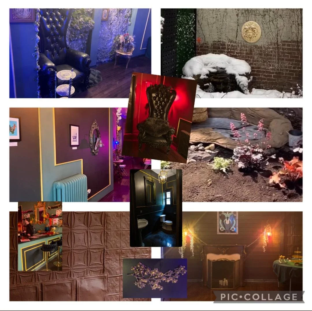 “shots of the space as well but finding some with hints of pink or blue or red as discussed in the meeting (I have the colors you see but play with the gel lights depending on the event/occasion). Along with this I found some texture to reflect that art deco/nature vibe.”